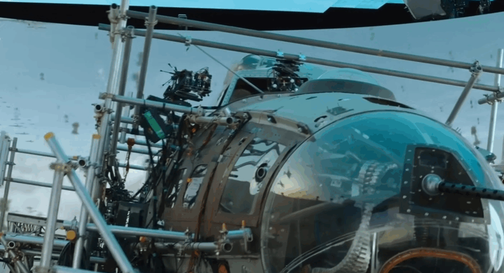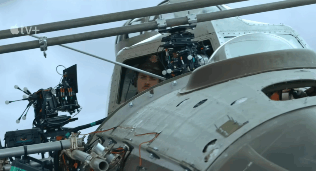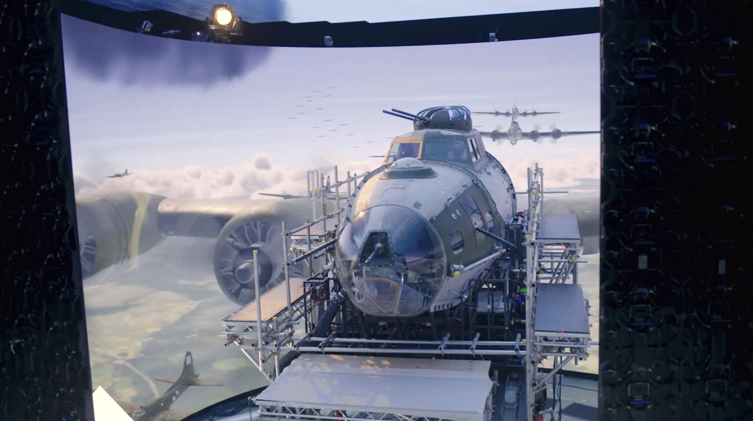A great application of LED volume shooting: the show’s cast playing pilots were filmed inside a life-size B-17 cockpit mounted on a huge motion rig. We surrounded the entire setup with an LED volume, which displayed pre-rendered flying and battle scenes.