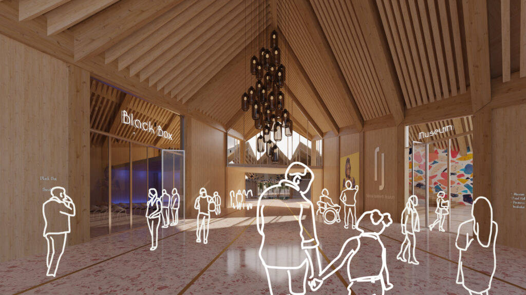 Global awareness of Juneteenth largely springs from the efforts of one woman, Ms. Opal Lee. Having embarked on a nationwide walking tour to help secure Juneteenth’s recognition as a federal holiday, Ms. Lee was filmed with the pen used by President Biden to sign the holiday into law in 2021. Her loping, mid-air motions with the presidential pen trace the contours of long-demolished Southside homes and museumgoers dancing in a proposed theater space: a literal through-line from sorrow to joy.