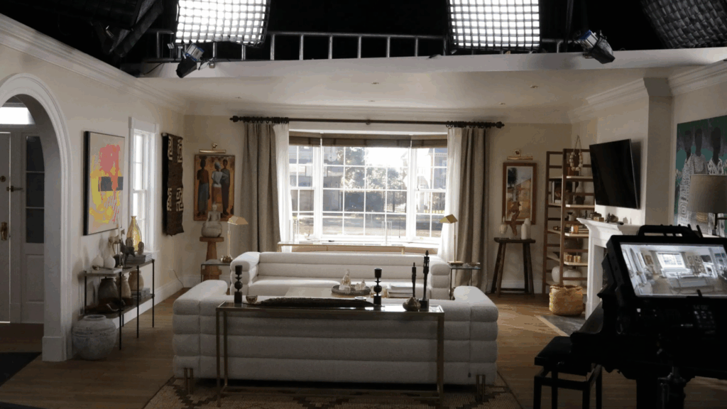 The digital environment outside the window was displayed on a 30-foot by 15-foot LED wall which can be seen on-camera at all times. Our team designed a way for objects and interactions in the digital environment to be triggered as-live when needed, whether it was weather simulations or cars driving past the window. This was done via a real-time application on an iPad which we gave to the AD to use as if they were queuing a real car to drive through the background of a shot.