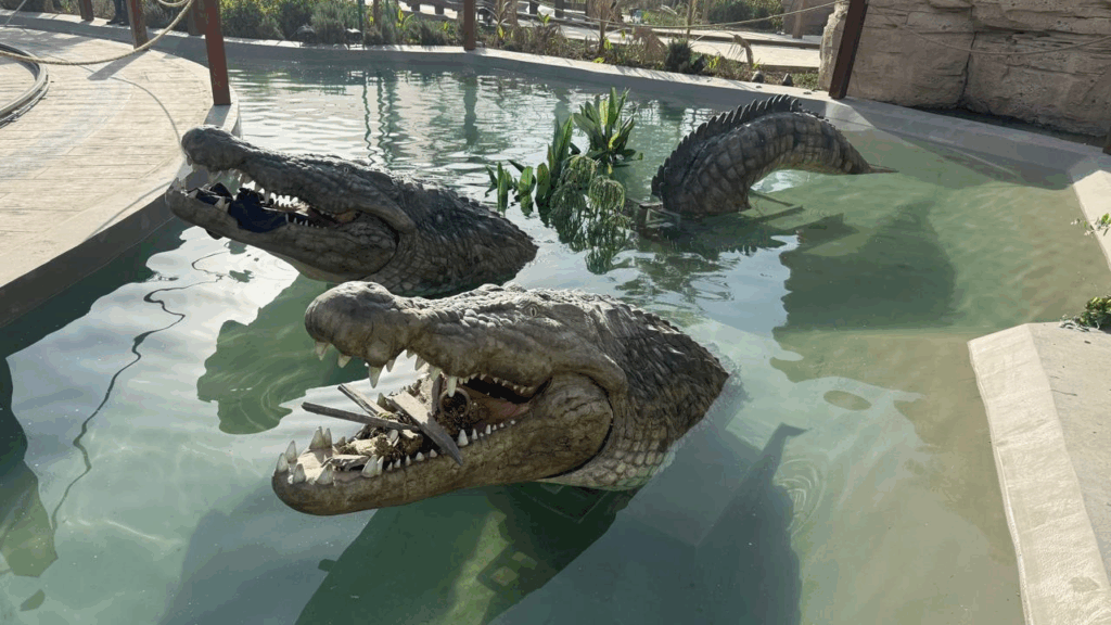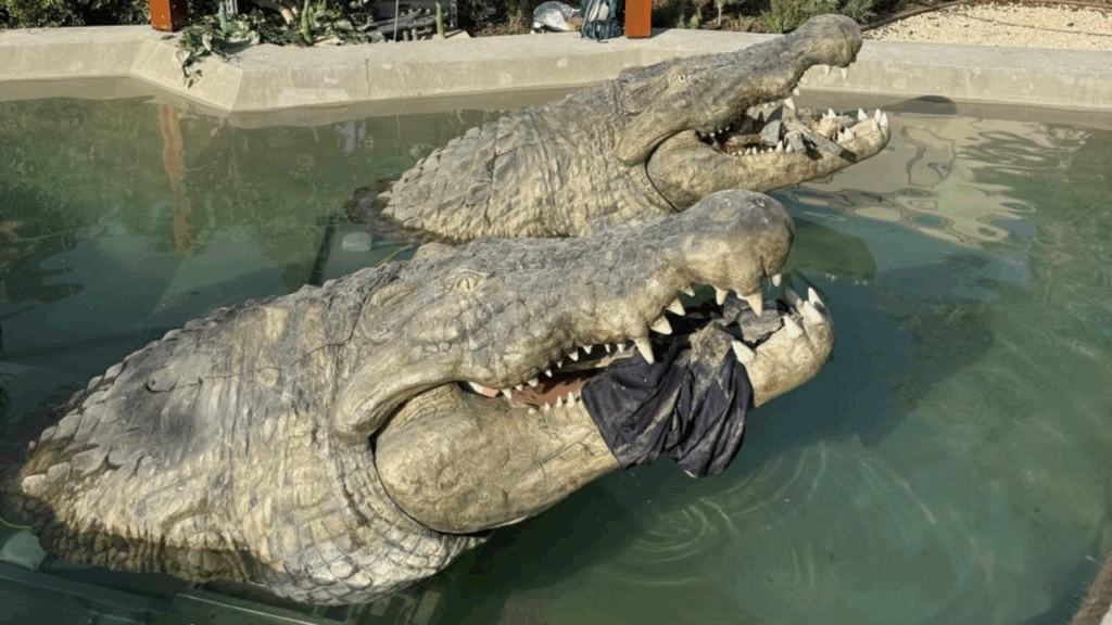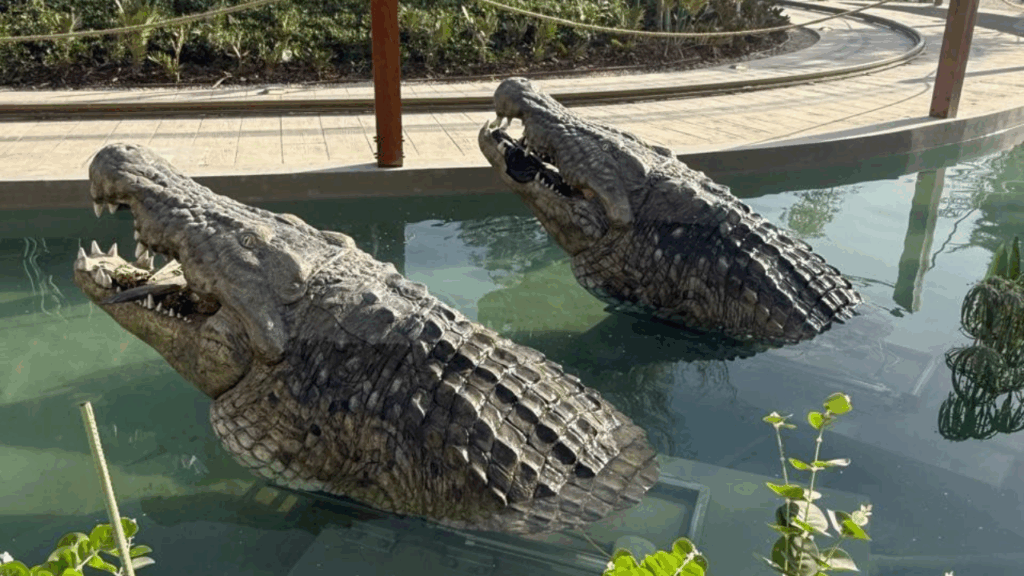 These unsettlingly realistic crocodiles burst from under the water as guests pass through the scene along a ride path in the Valley of Fortunes. Their movement is physical and immediate, timed to ride pacing and sightlines. Hydraulic systems drive each figure independently. Submerged bases, sealed scenic skins, and concealed access points allow the figures to operate reliably in wet conditions, with safety and maintenance resolved quietly within the surrounding scenery.