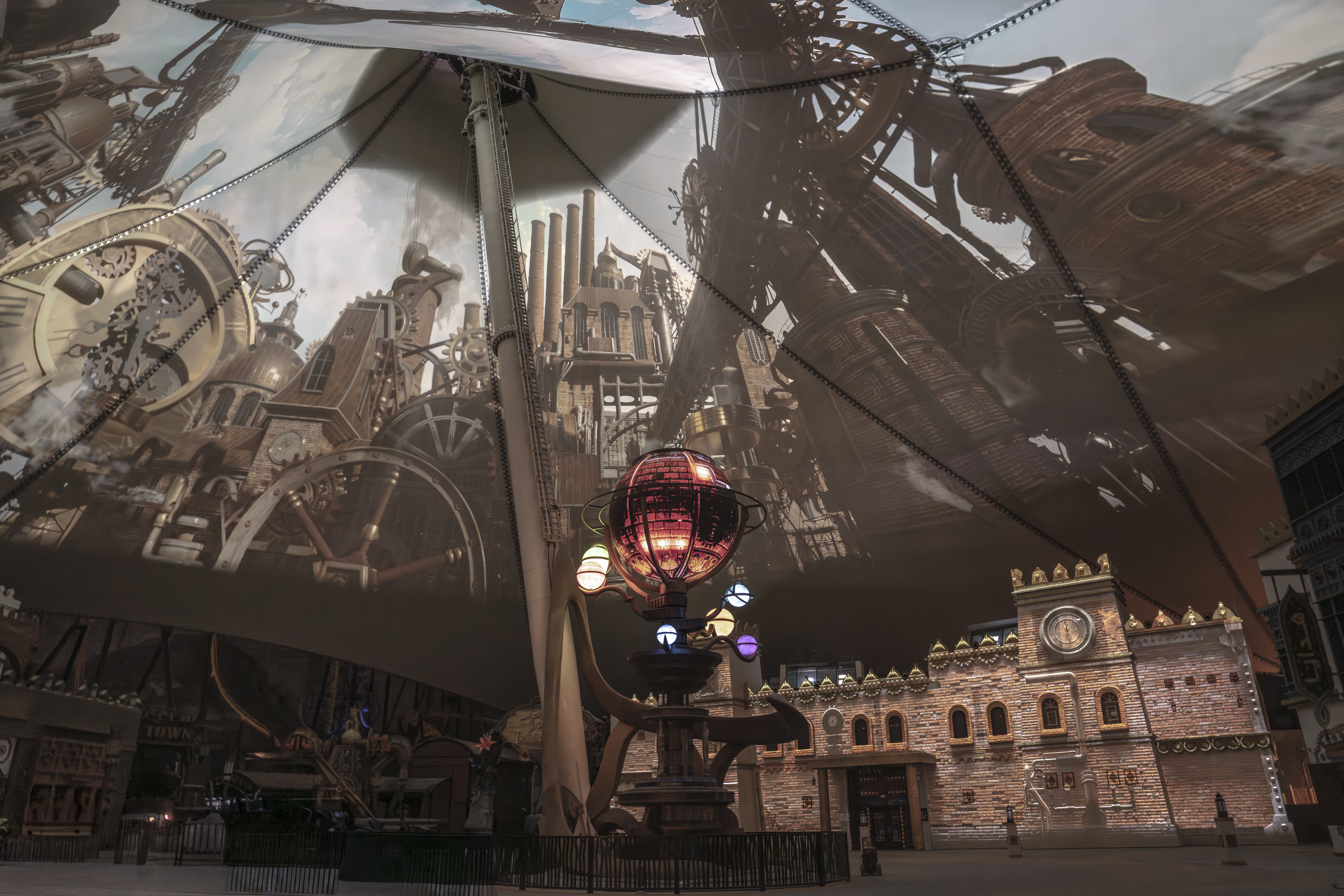 This monumental piece sits at the heart of the Citadel zone, forming one of the park’s most recognizable landmarks. At eight metres tall, it sits above the plaza as a constant point of movement, with six rotating rings circling a three-metre AV globe at its center. Mechanical movement, lighting, and media run continuously, while access, safety clearances, and servicing are built into the scenic form rather than added around it.
