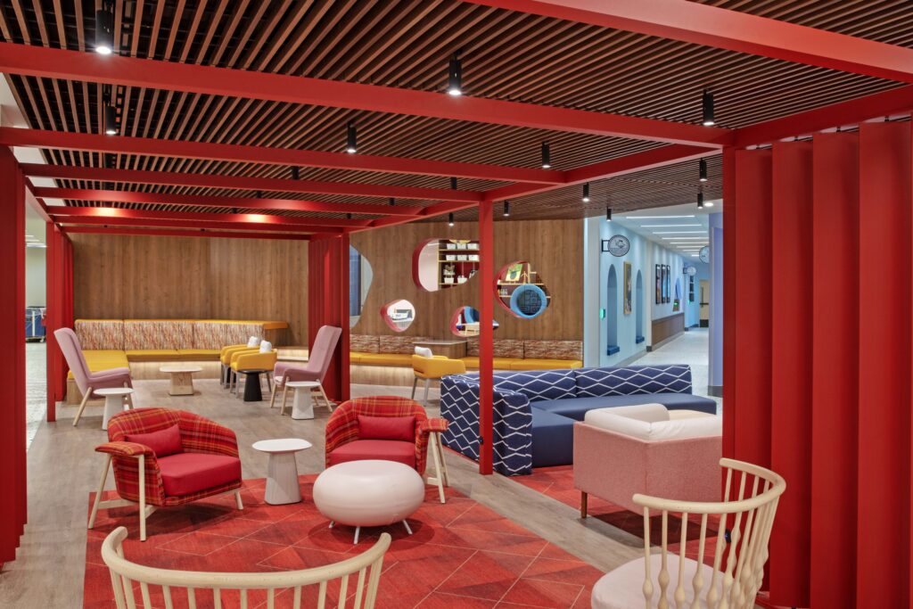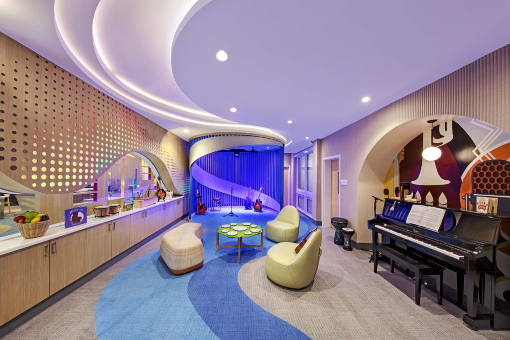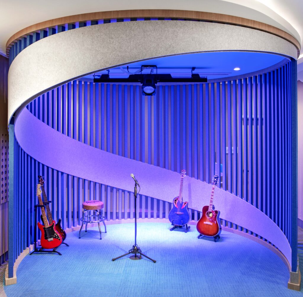Our physical studio envisioned the Commons as 25 distinct areas, each with a clear personality and purpose. For the Music Room, the latest LED technology underpins a wall-based interactive installation. Musical notes playing in the room trigger colored LEDs that illuminate through the wall’s perforations, creating a soothing yet playful feature. The room itself can host recitals, talent shows, plays and other performances.