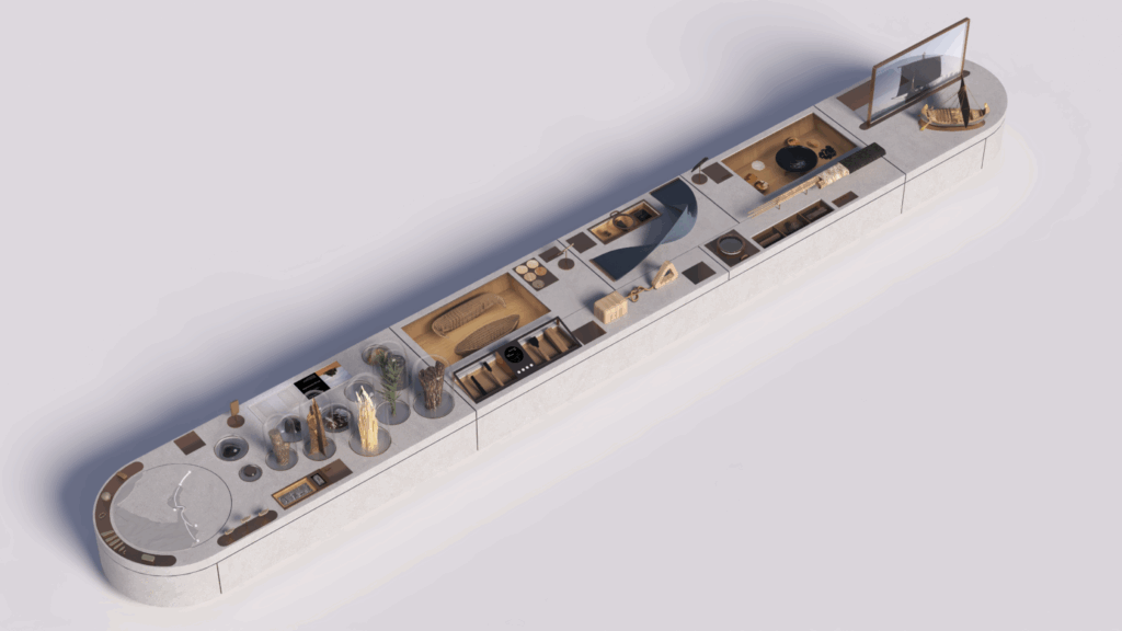 ”Visualising Past Inhabitants” is a story told through an archaeological narrative: a burial site on Marawah Island containing the remains of a woman from 5800 BCE, adorned with feathers, weapons and shark-tooth jewellery. Using existing film footage, we developed an interactive experience showing how scientists reconstruct her identity from archaeological evidence. A life-sized replica of the woman is displayed in the museum, surrounded by the objects she was buried with – a window into Neolithic life.